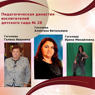 Можно смело считать фамилию ГОГОЛЕВЫ - педагогической династией воспитателей в 3-х поколениях. Через 57 лет общего педагогического стажа они сумели пронести любовь и заботу к детям, верность выбранной профессии.