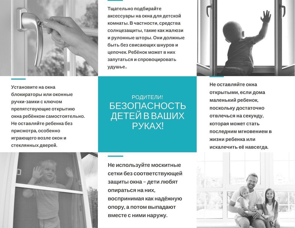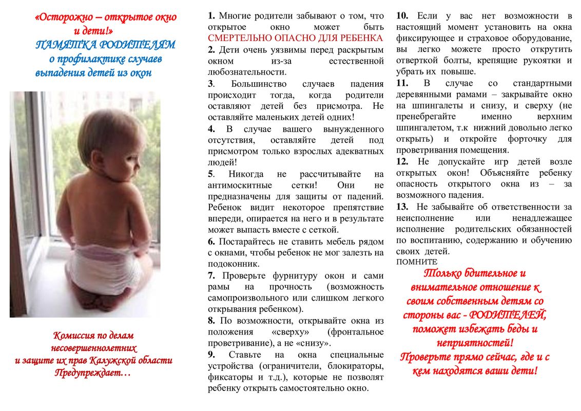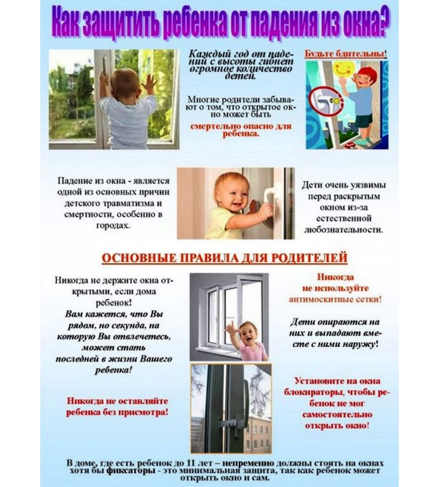 Если вы что-то показываете ребёнку из окна— всегда крепко фиксируйте его, будьте готовы к резким движениям малыша, держите ладони сухими, не держите ребёнка за одежду. Вы можете обратиться в специальные фирмы, занимающиеся их монтажом и выбрать наиболее подходящие вашему типу окон.