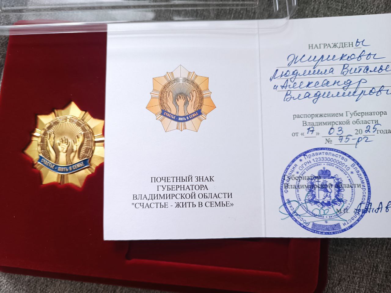 21 марта 2025 года в областной филармонии города Владимира состоялось торжественное награждение многодетной семьи Жириковых из города Гусь-Хрустальный. Людмила и Александр Жириковы были удостоены почетного знака губернатора "Счастье- жить в семье" за выдающийся вклад в укрепление семейных ценностей и достойное воспитание подрастающего поколения.