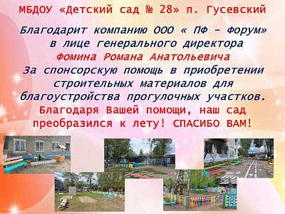 Коллектив детского сада благодарит за помощь ООО "ПФ-Форум" в лице директора Фомина Романа Анатольевича!