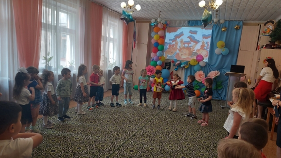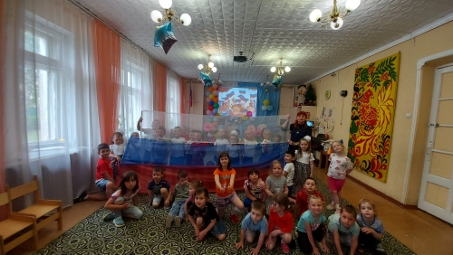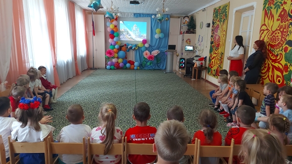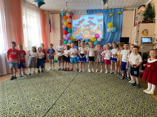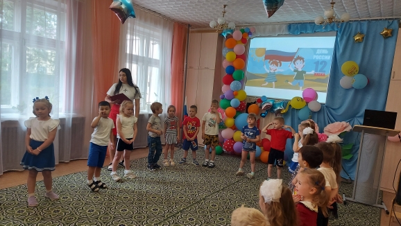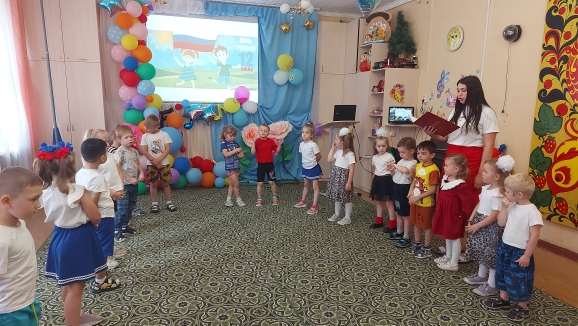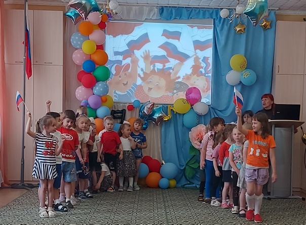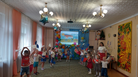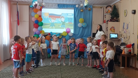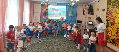 Ребята посмотрели познавательный видеоролик о России исполнили стихи, песни, танцы, активно поучаствовали в играх- эстафетах.