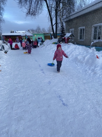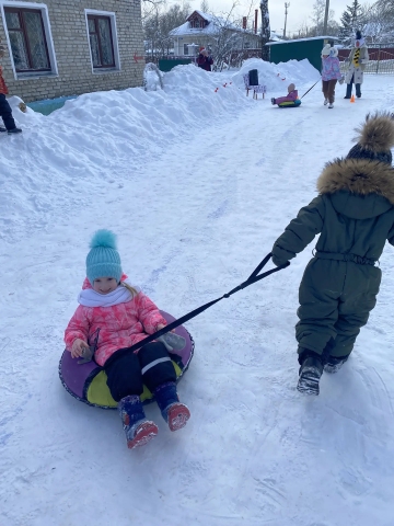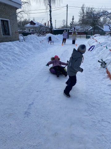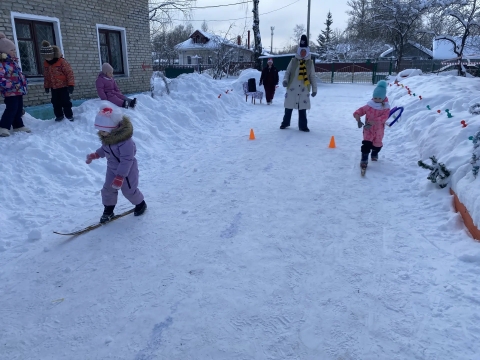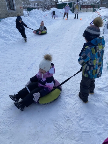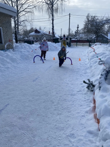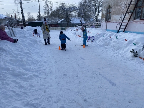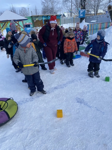На импровизированной площадке прошли весёлые эстафеты с ледянками, тюбингами, лыжами, клюшками.