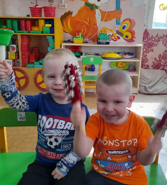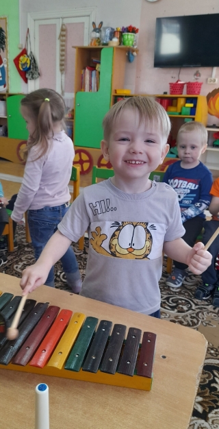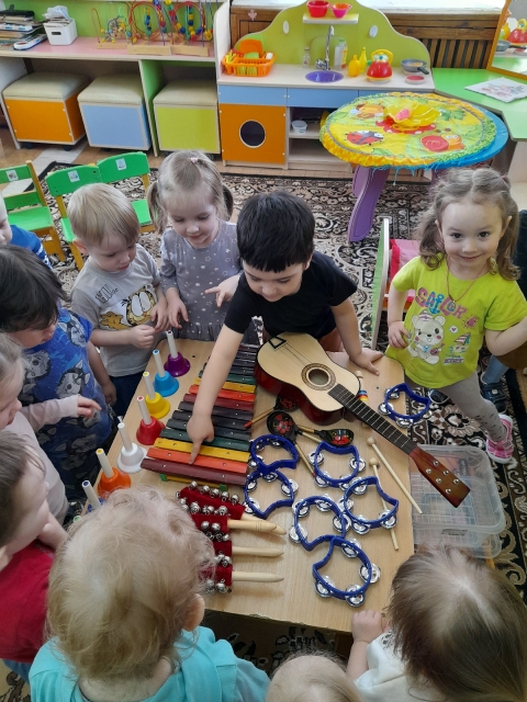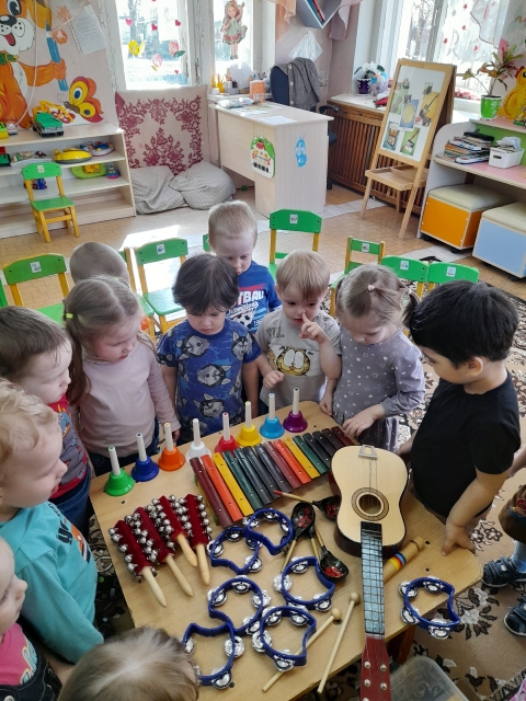 Наши ребята знакомятся и играют на музыкальных инструментах. Таким образом они приобщаются к прекрасному миру искусства.