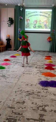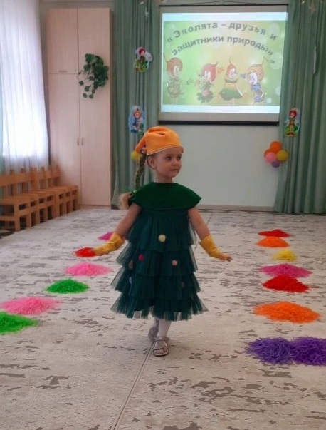 Каждым ребенком был представлен костюм из бросового материала ( пакеты, стаканчики, коробки и пр.) , шитые из ткани костюмы главных защитников природы- Елочки, Тихони, Шалуна, Умницы.