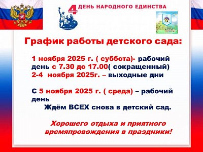 Вашему вниманию график работы сада в праздничные дня ноября 2025 г.